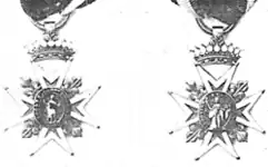 La croix, du type dit de Malte (huit branches), est d'or à deux faces, à huit pointes émaillée de blanc, vidées de bleu, bordées d'or, cantonnées dans chaque angle d'une fleur de lys d'or, les deux pointes supérieures étant surmontées d'une couronne comtale d'or perlée d'argent, et suspendue à un ruban large, bleu liseré de rouge[9].