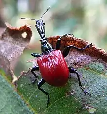 Le Charançon girafe est un coléoptère mesurant de 15 à 25 mm pour les mâles, et de 12 à 55 mm pour les femelles. le mâle qui a la particularité de présenter un cou particulièrement long, trois fois supérieure à celui des femelles[2] et pourvu d'une unique charnière. Cette caractéristique lui a valu son nom. Ce cou disproportionné lui sert à combattre lors de véritables joutes pour une femelle[3]. Sa taille variant selon le sexe du charançon marque un dimorphisme sexuel très présent. Ses élytres sont rouge vif et son corps noir brillant.