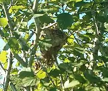 Le nid est construit en fin d'été par la femelle dans les branches d'un arbuste ou d'un arbre à feuilles caduques à une hauteur allant jusqu'à 10 mètres. La construction du nid dure environ six jours, période pendant laquelle la femelle travaille par tranches de 10 à 40 minutes. Le mâle vole souvent en compagnie de la femelle lorsqu'elle recherche des matériaux de nidification et même si le mâle peut transporter certains matériaux vers le nid, il laisse sa construction à la femelle. L'enveloppe extérieure du nid est faite d'écorces, d'herbes et de lianes[19]. Le diamètre intérieur du nid fini est d'environ 6,5 centimètres[15]. La base est renforcée par des écorces reliées par des toiles d'araignée et des soies de chenilles, alors que les bords sont faits de tiges d'asclépiade, de chardons ou de roseaux. Le fond du nid est si serré qu'il peut retenir de l'eau et il est possible que les oisillons se noient après une violente averse si les parents ne couvrent pas le nid[20],[21].