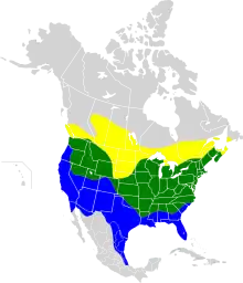 Son aire de reproduction estivale s'étend à travers toute l'Amérique du Nord, d'un océan à l'autre. Il est limité au nord par la Saskatchewan et s'étend vers le sud jusqu'en Caroline du Nord sur la côte est et le nord de la Californie sur la côte ouest[2]. Le chardonneret jaune migre sur de courtes distances vers le sud en raison des baisses de température entrainant une réduction des ressources alimentaires. La migration se fait en groupes compacts, volant de façon désordonnée, ondulatoire[19].