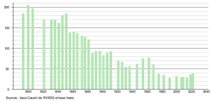L'évolution du nombre d'habitants est connue à travers les recensements de la population effectués dans la commune depuis 1793. Pour les communes de moins de 10 000 habitants, une enquête de recensement portant sur toute la population est réalisée tous les cinq ans, les populations légales des années intermédiaires étant quant à elles estimées par interpolation ou extrapolation[13]. Pour la commune, le premier recensement exhaustif entrant dans le cadre du nouveau dispositif a été réalisé en 2008[14].