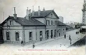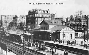 La compagnie des chemins de fer de l'Ouest, le , ouvre au service la gare de La Garenne-Bezons qui remplace, pour le service des voyageurs, la gare de Colombes-Embranchement. Elle est inaugurée le [7]. Sa desserte est effectuée uniquement par les trains de la ligne de Paris-Saint-Lazare à Saint-Germain-en-Laye qui marquent également l'arrêt pour la sécurité. Les trains de grandes lignes assurant la relation Paris – Le Havre ne la desservent pas[8]. La gare et son bâtiment voyageurs sont inaugurés le [9]. En 1893, la fonction de la gare évolue, la compagnie de l'Ouest ayant décidé qu'elle devient une « gare de transit pour les voyageurs entre la ligne de Saint-Germain et celle de Normandie ». Elle est donc ouverte à la desserte par les trains de grandes lignes pour éviter à nombre de voyageurs d'aller jusqu'à Paris pour revenir en banlieue ouest[10].
