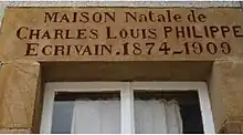 Charles-Louis Philippe, né le à Cérilly (Allier) et mort le à Paris, est un poète, critique littéraire, conteur, chroniqueur et romancier français. En 1908, c'est un des fondateurs de La Nouvelle Revue française (NRF) et l'auteur de Bubu de Montparnasse. Selon son ami Léon Werth[1], Charles-Louis Philippe devint l'un des précurseurs de la littérature populiste.
