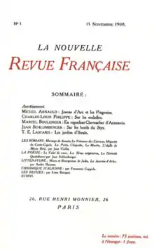 Au début de l'année 1908 il anime un mouvement avec les écrivains Henri Ghéon, Eugène Montfort, André Ruyters et Marcel Drouin, beau-frère d'André Gide, qui décide de créer une revue littéraire spécialisée intitulée La Nouvelle Revue Française et d'en proposer la direction à Montfort ; celui-ci allie quelques auteurs de son propre réseau et en tant qu'éditeur porte le no 1[40] ; André Gide participe solidairement par un article. Mais à l'issue du bouclage Philippe et ses amis s'unissant avec Gide s'opposent à Montfort sur les engagements éditoriaux de l'opus, notamment à propos d'une critique sur Mallarmé — auteur qu'ils défendent même s'ils combattent l'idéalisme — et d'un article en tendance d'éloge sur Gabriele D'Annunzio, qu'ils désapprouvent. Cet opus ne sera jamais distribué bien qu'il reste accessible dans la collection de la revue, redoublé par le no 1 de 1909 (quant à lui distribué comme l'opus inaugural, celui de la création des éditions de la NRF). Ultérieurement ils n'admettront pas davantage les décadentistes a fortiori ceux engagés dans le mouvement d'une renaissance culturelle des nations européennes, ou sensibles à ces avant-gardes idéologiques ; ils se situent contre la réaction « historiciste » qui réintègre les nationalismes en les déplaçant vers une conception impérialiste de l'Europe, sous la nouvelle idéologie de la culture pan-européenne para-révolutionnaire qui se développe alors. Sinon discuter de cela dans leurs pages, dont l'objet formel ne peut inclure le discours politique, contrairement à La Revue blanche (disparue en 1903) qu'ils admiraient cependant, ils veulent du moins que leurs actes d'écrivains en mouvement de revue s'en démarquent radicalement, la visée stylistique constituant la base d'un consensus minimal.