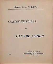 Auprès de Louis Lumet, Philippe devint en 1897 codirecteur de cette petite revue libertaire d'inspiration symboliste. Cette revue bimensuelle dirigée par Louis Lumet, Charles Louis Philippe et Jacques-Gabriel Prod’homme, fut au départ distribuée gratuitement, mais vu le manque d'audience lors de son inauguration, elle fut ouverte à abonnement par souscription volontaire. Les membres de ladite revue se réunissaient chaque premier samedi du mois dans une salle[28]du Café Procope. Au nombre des premiers auteurs familiers de la revue se trouvent René Ghil, Léon Frapié, Octave Mirbeau, Stéphane Mallarmé, Hugues Lapaire, Eugène Montfort, Jean Baffier, Augustin Hamon, Léon Riotor, Catulle Mendès, etc. En dehors de ses missions d'humble fonctionnaire parisien, Philippe, qui travaille depuis l'été 1896 à une composition non poétique, nourrit le projet de faire publier à compte d'auteur un premier ouvrage de nouvelles. Aux lendemains de la terrible catastrophe du Bazar de la Charité survenue le 4 mai 1897, Louis Lumet et Charles Louis Philippe sont alors deux jeunes écrivains de 27 & 23 ans pétris d'idéalisme et impatients de faire publier leurs premiers écrits. Fondateur en avril 1895 de la revue L'Enclos , Louis Lumet fait paraître le 29 mai 1897 dans cette modeste revue littéraire deux ouvrages de sa production La Vie d'Un et Conversation avec Idéa et pour la circonstance propose à son associé de faire publier le sien, intitulé Quatre Histoires de Pauvre Amour , très modeste texte qu'il dédie à Catulle Mendès. Un pas des plus importants venait de se produire pour la première fois dans la vie miséreuse de Charles Louis Philippe : celle de son entrée modeste et officielle dans le monde foisonnant et concurrentiel de La République des lettres.