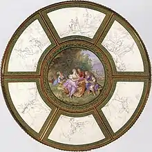 - Commode de Madame du Barry attribué à Martin Carlin, vers 1772. Deux plaques de porcelaine : d'après le tableau Par une tendre chansonnette de Nicolas Lancret (1690-1743) gravé par Charles-Nicolas Cochin, ornant le côté gauche ; L'Agréable société, avant 1772, d'après une œuvre de Jean-Baptiste Pater (1695-1736) gravée par Filloeul, au centre de la commode ;