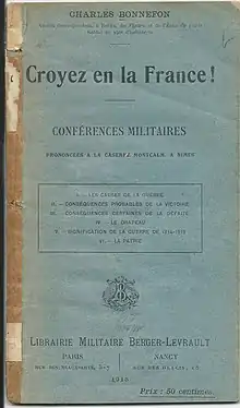 - Croyez en la France, six conférences militaires prononcées à la caserne Montcalm, à Nîmes : les causes de la guerre, conséquences probables de la victoire, conséquences certaines de la défaite, le drapeau, signification de la guerre de 1914-1915, la patrie. Berger-Levrault, 1915, 64 p.