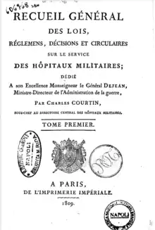 - Charles Courtin, Recueil général des lois, réglemens, décisions et circulaires sur le service des hôpitaux militaires, Paris, Imprimerie impériale, 1809, 2 volumes in-8° et 1 volume in-4° de tableaux.