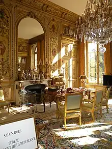 - Palais de l'Élysée, salon doré : bureau du Président de la République. Ce bureau Louis XV a été installé dans cette pièce à la demande du général de Gaulle. Chef d’œuvre du mobilier français, ce bureau est aujourd'hui considéré comme le meuble le plus précieux de l’Élysée[40]. Tous les Présidents de la Ve République, à l'exception de Valéry Giscard d'Estaing qui préféra s'installer dans un bureau d'angle, firent du salon doré leur lieu de travail.