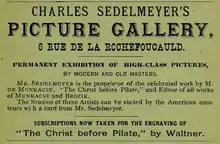 Sedelmeyer devint à la fin du siècle propriétaire de l'hôtel particulier de Madame de Sancy, dame d'honneur de l'impératrice Eugénie situé au no 6, rue de La Rochefoucauld à Paris, qu'il annexa au no 4 bis de la même rue, où il fit construire une galerie d'art, décrite comme étant « un hôtel princier de style Premier Empire »[7] qui servait toutes ses activités : l’achat et la vente de peintures de maîtres anciens haut de gamme, la publication de somptueux livres et estampes, l’organisation de ventes aux enchères et d’expositions d’artistes vivants plus ou moins établis[2]. En 1885, Sedelmeyer consacre une grande exposition des toiles du peintre James Tissot. En juin 1890, il assure la vente de la collection du sénateur belge Prosper Crabbe (1827-1889).