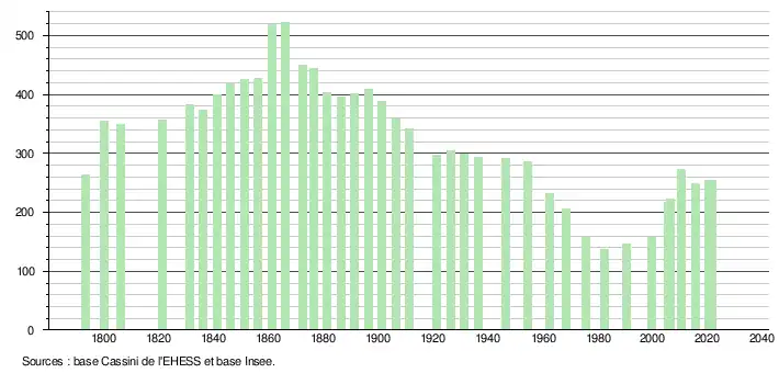L'évolution du nombre d'habitants est connue à travers les recensements de la population effectués dans la commune depuis 1793. Pour les communes de moins de 10 000 habitants, une enquête de recensement portant sur toute la population est réalisée tous les cinq ans, les populations légales des années intermédiaires étant quant à elles estimées par interpolation ou extrapolation[16]. Pour la commune, le premier recensement exhaustif entrant dans le cadre du nouveau dispositif a été réalisé en 2005[17].