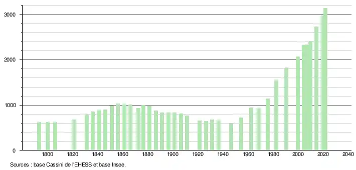 L'évolution du nombre d'habitants est connue à travers les recensements de la population effectués dans la commune depuis 1793. Pour les communes de moins de 10 000 habitants, une enquête de recensement portant sur toute la population est réalisée tous les cinq ans, les populations légales des années intermédiaires étant quant à elles estimées par interpolation ou extrapolation[21]. Pour la commune, le premier recensement exhaustif entrant dans le cadre du nouveau dispositif a été réalisé en 2004[22].
