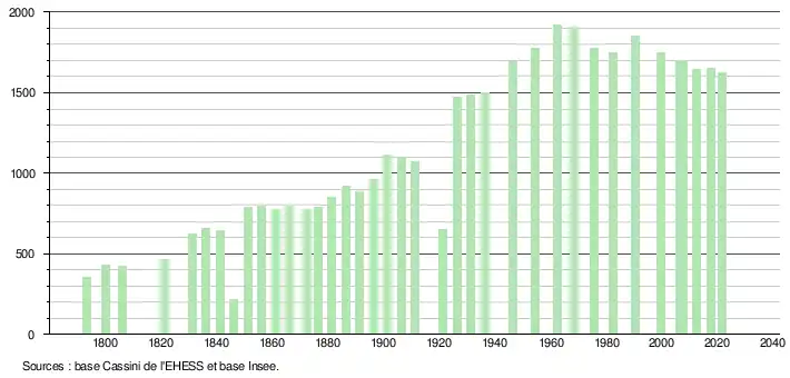 L'évolution du nombre d'habitants est connue à travers les recensements de la population effectués dans la commune depuis 1793. Pour les communes de moins de 10 000 habitants, une enquête de recensement portant sur toute la population est réalisée tous les cinq ans, les populations légales des années intermédiaires étant quant à elles estimées par interpolation ou extrapolation[25]. Pour la commune, le premier recensement exhaustif entrant dans le cadre du nouveau dispositif a été réalisé en 2007[26].
