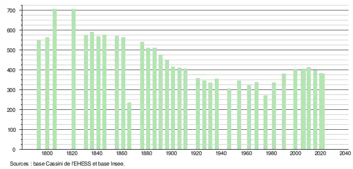 L'évolution du nombre d'habitants est connue à travers les recensements de la population effectués dans la commune depuis 1793. Pour les communes de moins de 10 000 habitants, une enquête de recensement portant sur toute la population est réalisée tous les cinq ans, les populations légales des années intermédiaires étant quant à elles estimées par interpolation ou extrapolation[17]. Pour la commune, le premier recensement exhaustif entrant dans le cadre du nouveau dispositif a été réalisé en 2005[18].