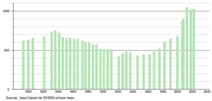 L'évolution du nombre d'habitants est connue à travers les recensements de la population effectués dans la commune depuis 1793. Pour les communes de moins de 10 000 habitants, une enquête de recensement portant sur toute la population est réalisée tous les cinq ans, les populations légales des années intermédiaires étant quant à elles estimées par interpolation ou extrapolation[16]. Pour la commune, le premier recensement exhaustif entrant dans le cadre du nouveau dispositif a été réalisé en 2007[17].