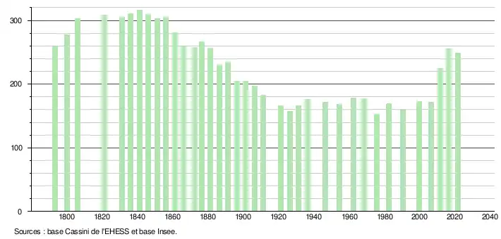 L'évolution du nombre d'habitants est connue à travers les recensements de la population effectués dans la commune depuis 1793. Pour les communes de moins de 10 000 habitants, une enquête de recensement portant sur toute la population est réalisée tous les cinq ans, les populations légales des années intermédiaires étant quant à elles estimées par interpolation ou extrapolation[16]. Pour la commune, le premier recensement exhaustif entrant dans le cadre du nouveau dispositif a été réalisé en 2006[17].