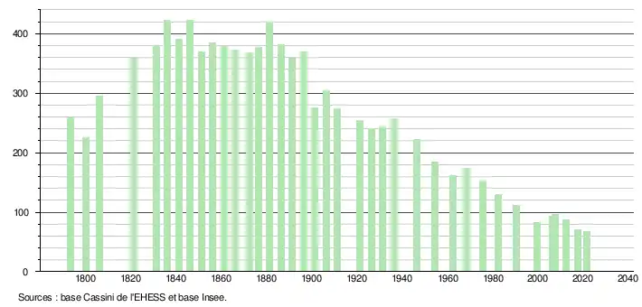 L'évolution du nombre d'habitants est connue à travers les recensements de la population effectués dans la commune depuis 1793. Pour les communes de moins de 10 000 habitants, une enquête de recensement portant sur toute la population est réalisée tous les cinq ans, les populations légales des années intermédiaires étant quant à elles estimées par interpolation ou extrapolation[18]. Pour la commune, le premier recensement exhaustif entrant dans le cadre du nouveau dispositif a été réalisé en 2007[19].