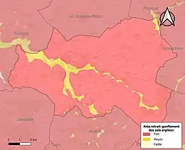 Les mouvements de terrains susceptibles de se produire sur la commune sont des affaissements et effondrements liés aux cavités souterraines (hors mines) et des tassements différentiels[20]. Afin de mieux appréhender le risque d’affaissement de terrain, un inventaire national permet de localiser les éventuelles cavités souterraines sur la commune[21]. Le retrait-gonflement des sols argileux est susceptible d'engendrer des dommages importants aux bâtiments en cas d’alternance de périodes de sécheresse et de pluie[22]. La totalité de la commune est en aléa moyen ou fort (79,5 % au niveau départemental et 48,5 % au niveau national)[Carte 2]. Depuis le , en application de la loi ÉLAN, différentes contraintes s'imposent aux vendeurs, maîtres d'ouvrages ou constructeurs de biens situés dans une zone classée en aléa moyen ou fort[Note 2],[23].