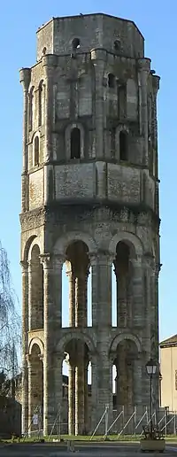 - L’abbaye Saint-Sauveur de Charroux est une abbaye bénédictine, fondée en 785, par Roger, vicomte de Limoges, et Charlemagne, dont relevaient 152 églises et prieurés en 1471[31]. Il en reste la tour-lanterne du XIe siècle, dite tour Charlemagne, centre de la rotonde de l'église abbatiale, le cloître et quelques piliers du chœur et du transept. L'ensemble fut sauvé de la démolition en 1790 par l'abbé Charles Loyzeau de Grandmaison (1740-1797) alors curé de Surin.