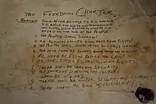 La Charte de la liberté fut adoptée lors d'un « congrès du peuple » réunissant diverses organisations politiques anti-apartheid et des délégués provenant de toutes les régions du pays. L'année suivante, elle fut adoptée par l'ANC mais aussi également reconnue par l'Assemblée générale des Nations unies comme document politique officiel incarnant les exigences et aspirations de toutes les couches de la population sud-africaine.