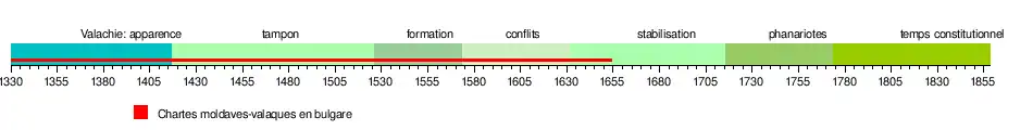 Les chartes moldaves et valaques en bulgare ancien (comme l'on désigne le slavon en Bulgarie) ont été émises par les voïvodes valaques et moldaves, ainsi que par d'autres aristocrates ou marchands[3], entre les XIVe et XVIIe siècles. À ce jour, plus de 200 chartes de ce type ont été conservées[4].