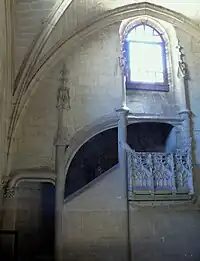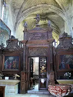 Une porte au nord du chœur permet d'accéder à la sacristie voûtée d'ogives. Un escalier permet d'accéder à une salle supérieure qui servait à conserver les archives et de bibliothèque.