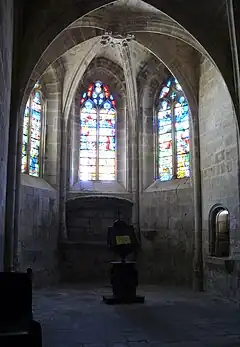 La chapelle est éclairée par cinq fenêtres à remplage flamboyant dans l'abside et une rose à l'ouest.