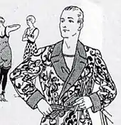 Ce goût « flamboyant »[181] s'exprime également dans l'ornement de peignoirs de plage aux motifs de plus de quarante centimètres de large[182], qui connurent un grand succès à Palm Beach à la fin des années vingt[181]. Certains modèles sont inspirés de motifs traditionnels (voir illustration à gauche) ; d'autres, plus abstraits[183], évoquent Matisse[181].