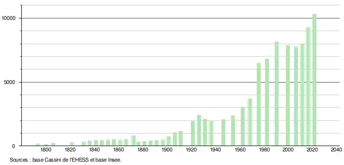 3. Par convention dans Wikipédia, le principe a été retenu de n’afficher dans le tableau des recensements et le graphique, pour les populations légales postérieures à 1999, que les populations correspondant à une enquête exhaustive de recensement pour les communes de moins de 10 000 habitants, et que les populations des années 2006, 2011, 2016, etc. pour les communes de plus de 10 000 habitants, ainsi que la dernière population légale publiée par l’Insee pour l'ensemble des communes.