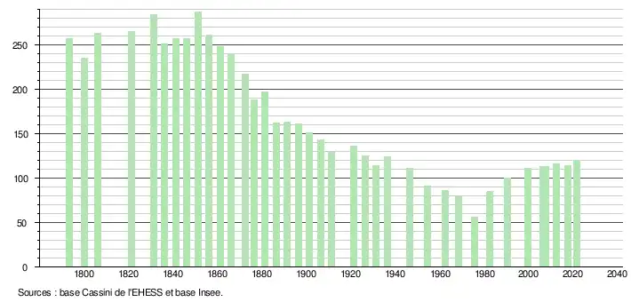 L'évolution du nombre d'habitants est connue à travers les recensements de la population effectués dans la commune depuis 1793. Pour les communes de moins de 10 000 habitants, une enquête de recensement portant sur toute la population est réalisée tous les cinq ans, les populations légales des années intermédiaires étant quant à elles estimées par interpolation ou extrapolation[20]. Pour la commune, le premier recensement exhaustif entrant dans le cadre du nouveau dispositif a été réalisé en 2007[21].