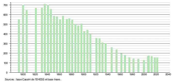 L'évolution du nombre d'habitants est connue à travers les recensements de la population effectués dans la commune depuis 1793. Pour les communes de moins de 10 000 habitants, une enquête de recensement portant sur toute la population est réalisée tous les cinq ans, les populations légales des années intermédiaires étant quant à elles estimées par interpolation ou extrapolation[18]. Pour la commune, le premier recensement exhaustif entrant dans le cadre du nouveau dispositif a été réalisé en 2007[19].