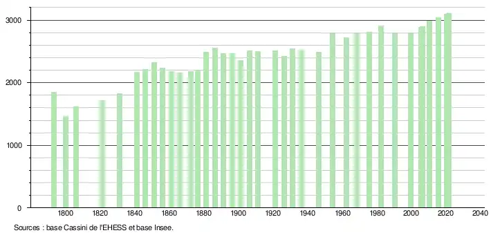 - Population municipale légale en vigueur au 1er janvier 2024, millésimée 2021, définie dans les limites territoriales en vigueur au 1er janvier 2023, date de référence statistique : 1er janvier 2021.
