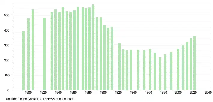 L'évolution du nombre d'habitants est connue à travers les recensements de la population effectués dans la commune depuis 1793. Pour les communes de moins de 10 000 habitants, une enquête de recensement portant sur toute la population est réalisée tous les cinq ans, les populations légales des années intermédiaires étant quant à elles estimées par interpolation ou extrapolation[16]. Pour la commune, le premier recensement exhaustif entrant dans le cadre du nouveau dispositif a été réalisé en 2006[17].