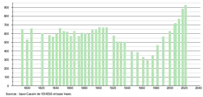 L'évolution du nombre d'habitants est connue à travers les recensements de la population effectués dans la commune depuis 1793. Pour les communes de moins de 10 000 habitants, une enquête de recensement portant sur toute la population est réalisée tous les cinq ans, les populations légales des années intermédiaires étant quant à elles estimées par interpolation ou extrapolation[26]. Pour la commune, le premier recensement exhaustif entrant dans le cadre du nouveau dispositif a été réalisé en 2007[27].