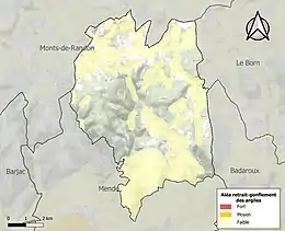 Le retrait-gonflement des sols argileux est susceptible d'engendrer des dommages importants aux bâtiments en cas d’alternance de périodes de sécheresse et de pluie. Aucune partie du territoire de la commune n'est en aléa moyen ou fort (15,8 % au niveau départemental et 48,5 % au niveau national). Sur les 382 bâtiments dénombrés sur la commune en 2019, aucun n'est en aléa moyen ou fort, à comparer aux 14 % au niveau départemental et 54 % au niveau national. Une cartographie de l'exposition du territoire national au retrait gonflement des sols argileux est disponible sur le site du BRGM[19],[Carte 2].