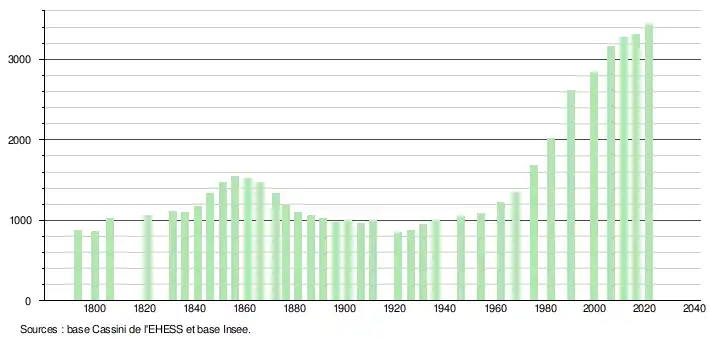 L'évolution du nombre d'habitants est connue à travers les recensements de la population effectués dans la commune depuis 1793. Pour les communes de moins de 10 000 habitants, une enquête de recensement portant sur toute la population est réalisée tous les cinq ans, les populations légales des années intermédiaires étant quant à elles estimées par interpolation ou extrapolation[31]. Pour la commune, le premier recensement exhaustif entrant dans le cadre du nouveau dispositif a été réalisé en 2006[32].