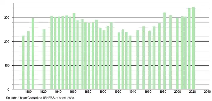 L'évolution du nombre d'habitants est connue à travers les recensements de la population effectués dans la commune depuis 1793. Pour les communes de moins de 10 000 habitants, une enquête de recensement portant sur toute la population est réalisée tous les cinq ans, les populations légales des années intermédiaires étant quant à elles estimées par interpolation ou extrapolation[14]. Pour la commune, le premier recensement exhaustif entrant dans le cadre du nouveau dispositif a été réalisé en 2005[15].