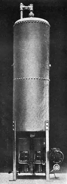 Lorsqu'une chaudière pour le chauffage des pièces est utilisée, l'installation traditionnelle au Royaume-Uni consiste à utiliser l'eau chauffée par la chaudière (primaire - primary) pour chauffer l'eau potable (en anglais secondary) contenue dans un récipient cylindrique (généralement en cuivre) qui est fournie par un récipient ou récipient de stockage d'eau froide, généralement dans l'espace de toit du bâtiment. Cela produit une alimentation assez régulière en eau chaude sanitaire (ECS) à basse pression statique mais généralement avec un bon débit. Dans la plupart des autres parties du monde, les appareils de chauffage à eau n'utilisent pas de récipient ou de réservoir de stockage d'eau froide, mais chauffent l'eau à des pressions proches de celles entrantes du réseau d'alimentation en eau.