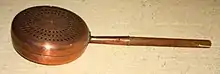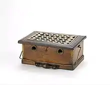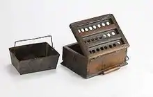 - Petit panier métallique muni d’anses en fil de fer sur lequel était déposée une briquette de terre cuite vernissée préalablement chauffée sur la braise.