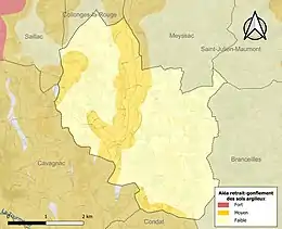 Le retrait-gonflement des sols argileux est susceptible d'engendrer des dommages importants aux bâtiments en cas d’alternance de périodes de sécheresse et de pluie. 27,7 % de la superficie communale est en aléa moyen ou fort (26,8 % au niveau départemental et 48,5 % au niveau national). Sur les 236 bâtiments dénombrés sur la commune en 2019, 61 sont en aléa moyen ou fort, soit 26 %, à comparer aux 36 % au niveau départemental et 54 % au niveau national. Une cartographie de l'exposition du territoire national au retrait gonflement des sols argileux est disponible sur le site du BRGM[16],[Carte 2].