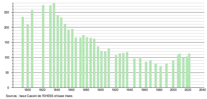 L'évolution du nombre d'habitants est connue à travers les recensements de la population effectués dans la commune depuis 1793. Pour les communes de moins de 10 000 habitants, une enquête de recensement portant sur toute la population est réalisée tous les cinq ans, les populations légales des années intermédiaires étant quant à elles estimées par interpolation ou extrapolation[15]. Pour la commune, le premier recensement exhaustif entrant dans le cadre du nouveau dispositif a été réalisé en 2008[16].