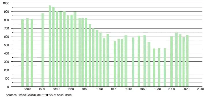 L'évolution du nombre d'habitants est connue à travers les recensements de la population effectués dans la commune depuis 1793. Pour les communes de moins de 10 000 habitants, une enquête de recensement portant sur toute la population est réalisée tous les cinq ans, les populations légales des années intermédiaires étant quant à elles estimées par interpolation ou extrapolation[23]. Pour la commune, le premier recensement exhaustif entrant dans le cadre du nouveau dispositif a été réalisé en 2006[24].
