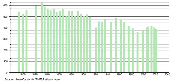 L'évolution du nombre d'habitants est connue à travers les recensements de la population effectués dans la commune depuis 1793. Pour les communes de moins de 10 000 habitants, une enquête de recensement portant sur toute la population est réalisée tous les cinq ans, les populations légales des années intermédiaires étant quant à elles estimées par interpolation ou extrapolation[23]. Pour la commune, le premier recensement exhaustif entrant dans le cadre du nouveau dispositif a été réalisé en 2008[24].