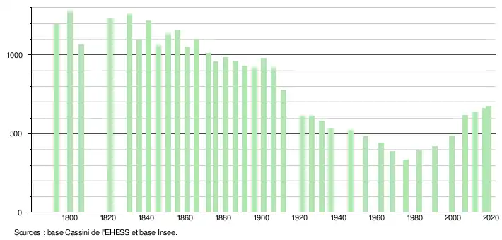 L'évolution du nombre d'habitants est connue à travers les recensements de la population effectués dans la commune depuis 1793. Pour les communes de moins de 10 000 habitants, une enquête de recensement portant sur toute la population est réalisée tous les cinq ans, les populations légales des années intermédiaires étant quant à elles estimées par interpolation ou extrapolation[5]. Pour la commune, le premier recensement exhaustif entrant dans le cadre du nouveau dispositif a été réalisé en 2006[6].