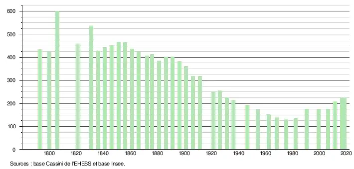 L'évolution du nombre d'habitants est connue à travers les recensements de la population effectués dans la commune depuis 1793. Pour les communes de moins de 10 000 habitants, une enquête de recensement portant sur toute la population est réalisée tous les cinq ans, les populations légales des années intermédiaires étant quant à elles estimées par interpolation ou extrapolation[2]. Pour la commune, le premier recensement exhaustif entrant dans le cadre du nouveau dispositif a été réalisé en 2006[3].