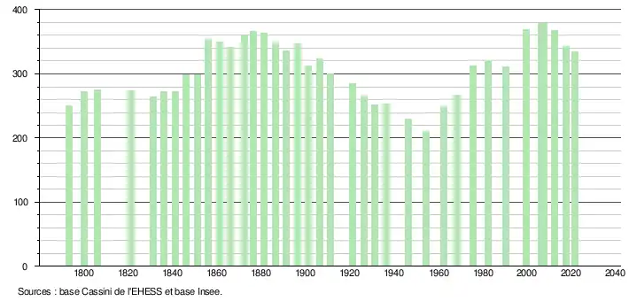 L'évolution du nombre d'habitants est connue à travers les recensements de la population effectués dans la commune depuis 1793. Pour les communes de moins de 10 000 habitants, une enquête de recensement portant sur toute la population est réalisée tous les cinq ans, les populations légales des années intermédiaires étant quant à elles estimées par interpolation ou extrapolation[22]. Pour la commune, le premier recensement exhaustif entrant dans le cadre du nouveau dispositif a été réalisé en 2007[23].