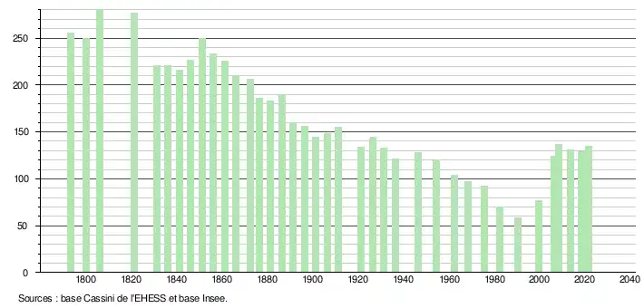 L'évolution du nombre d'habitants est connue à travers les recensements de la population effectués dans la commune depuis 1793. Pour les communes de moins de 10 000 habitants, une enquête de recensement portant sur toute la population est réalisée tous les cinq ans, les populations légales des années intermédiaires étant quant à elles estimées par interpolation ou extrapolation[20]. Pour la commune, le premier recensement exhaustif entrant dans le cadre du nouveau dispositif a été réalisé en 2008[21].