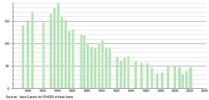 L'évolution du nombre d'habitants est connue à travers les recensements de la population effectués dans la commune depuis 1793. Pour les communes de moins de 10 000 habitants, une enquête de recensement portant sur toute la population est réalisée tous les cinq ans, les populations légales des années intermédiaires étant quant à elles estimées par interpolation ou extrapolation[17]. Pour la commune, le premier recensement exhaustif entrant dans le cadre du nouveau dispositif a été réalisé en 2005[18].