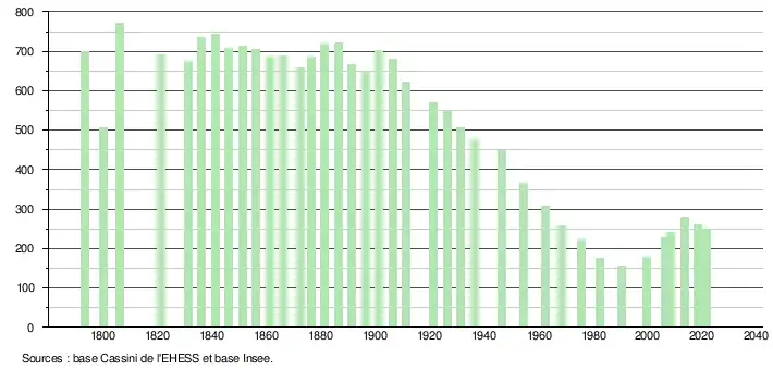 L'évolution du nombre d'habitants est connue à travers les recensements de la population effectués dans la commune depuis 1793. Pour les communes de moins de 10 000 habitants, une enquête de recensement portant sur toute la population est réalisée tous les cinq ans, les populations légales des années intermédiaires étant quant à elles estimées par interpolation ou extrapolation[16]. Pour la commune, le premier recensement exhaustif entrant dans le cadre du nouveau dispositif a été réalisé en 2008[17].
