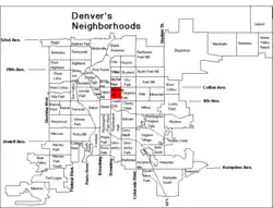 Les limites du quartier sont la Colfax Avenue au nord, la huitième avenue au sud, la York Street à l'est et la Downing Street à l'ouest. La partie plus commerciale du quartier se situe au nord près de la Colfax Avenue.